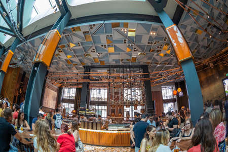 MILAN, ITALY - JUNE 29, 2019: Wide angle view of the interior of the Starbucks concept store in Milan, know as Starbucks Reserve Roastery, inside the historic Post building in Piazza Cordusio.