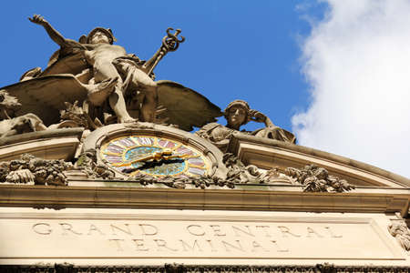 Sculpture and clock on the facade of Grand Central Station in New York City.