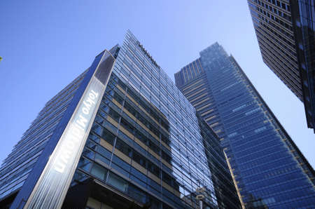 The image showcases several skyscrapers from a low-angle perspective, emphasizing their height and architectural detail. The composition includes buildings with reflective surfaces. The setting appears to be a city during daylight hours, with sunlight illuminating the scene. The image displays a perspective shot highlighting the buildings.