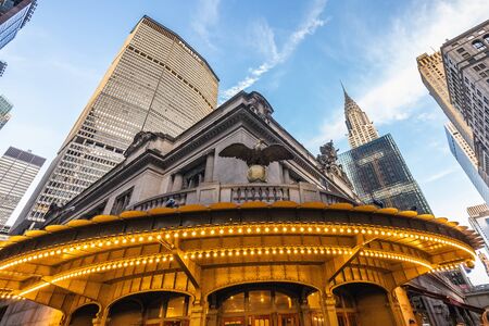 New York, USA - October 4, 2017: Grand central building with eagle at entrance and chrysler and MEetlife building in background.