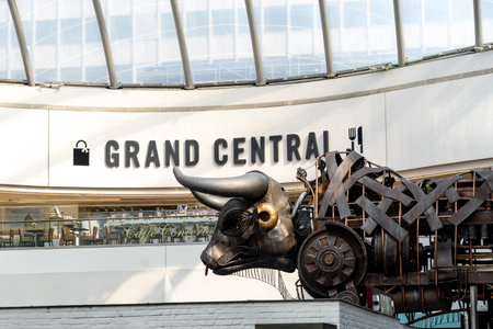 BIRMINGHAM NEW STREET STATION, UK - SEPTEMBER 7, 2023. Ozzy the mechanical bull used as a mascot for the Commonwealth Games now stands in the concourse of Grand Central at Birmingham New Street Railway Station