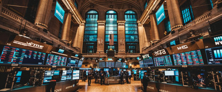 Panoramic view of a busy stock exchange floor with multiple trading screens and traders, showcasing financial market activity