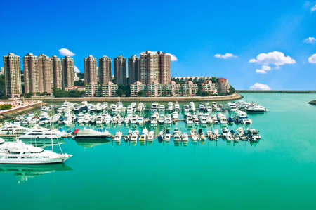 Aerial view on the harbor with boats and yachts. Beautiful composition with sea transport