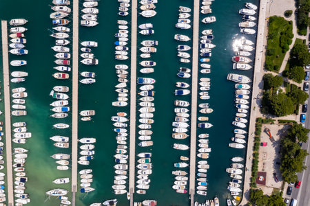 Aerial top down view of parked boats, motorboats and sailboats at marina piers.