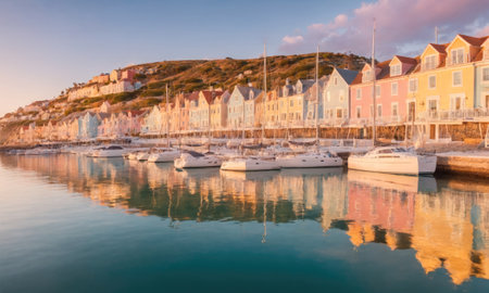 Colorful Waterfront Houses Reflecting on Calm Waters at Sunset in a Coastal Village