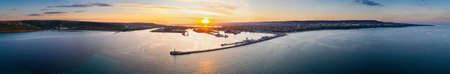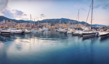 Aerial view to port or harbor with luxury boats during lovely sunset