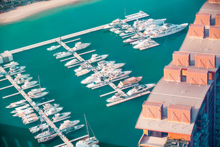 Dubai, UAE - August 28, 2022: Palm Jumeirah yachts pier and holidays villas view at sunset