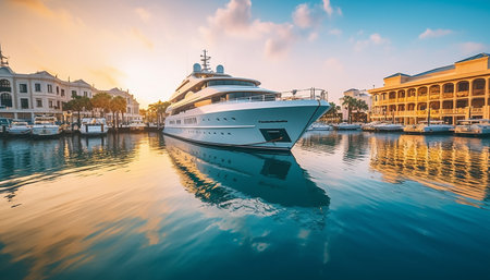 Luxury yacht sails at dusk, reflecting cityscape in tranquil waters generated by artificial intelligence