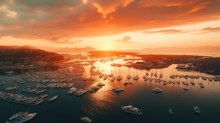 A breathtaking sunset over a vibrant harbor filled with luxury yachts, showcasing colorful skies and tranquil water reflections, perfect for travel inspiration.