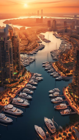 A bustling harbor filled with numerous boats docked beside towering buildings. The scene encapsulates the maritime activity and urban integration in this bustling city waterfront.