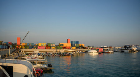 Containers and small boats on the waterfront in the Old Port area of ​​Doha, Qatar