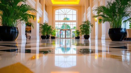 This stunning hotel lobby features a polished floor reflecting lush plants and elegant decor, creating a welcoming and serene ambiance for guests.