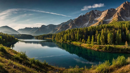 In the morning light a serene landscape unfolds, where the tranquil lake reflects the majestic mountains and their enchanting surroundings, creating a scene that feels both timeless and magical