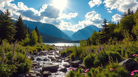 a stunning stock photo capturing the beauty of a sunrise as it shines through the mountains in a rocky landscape. this photo showcases sparkling water reflections, romantic riverscapes, and the breathtaking nature of norway. with its photo-realistic landscapes and pastoral scenery, this high-resolution image is perfect for those seeking a cabincore aesthetic or looking to enhance their visual content with 8k resolution. ai generated