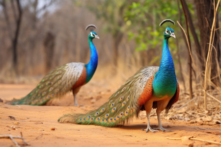 two peacocks, one with full-spread feathers, the other observing, created with generative ai