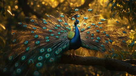 Flaming peacock showcasing its feathers during golden hour at sunset. AI generated