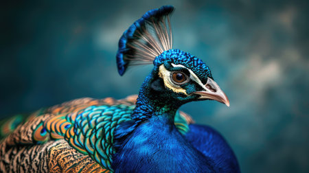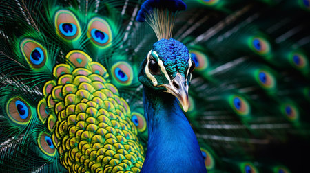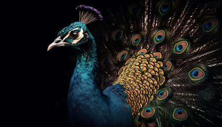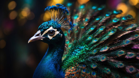 Close up of a peacock displaying its vibrant plumage, a symbol of beauty and elegance in nature