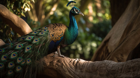 Image of beautiful peacock in the fertile forest. Bird. Nature. Illustration, Generative AI.