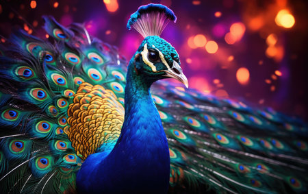 A peacock with bright plumage against a stylish bokeh background, creating an effect of depth and highlighting the beauty of the bird.