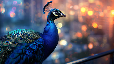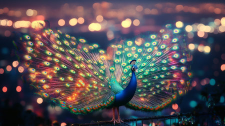 Peacock with holographic patterns on its tail feathers, illuminated by futuristic city lights generative ai