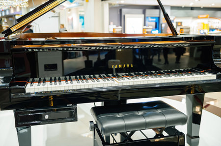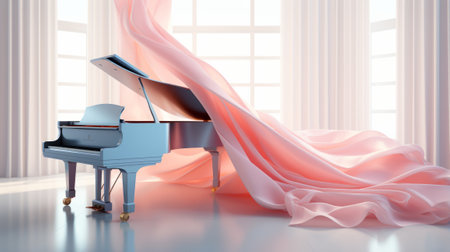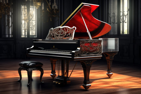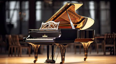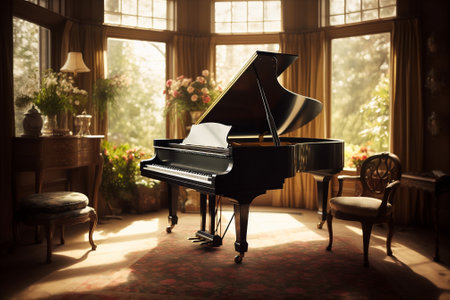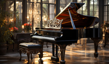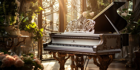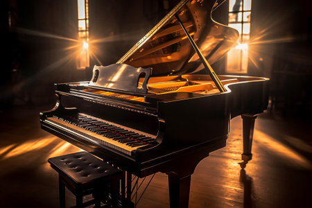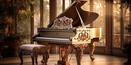 Close up of an elegant grand piano with warm sunlight, luxury, romantic scenery, music instrument