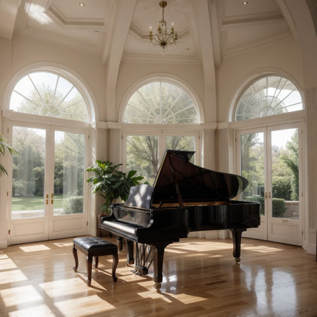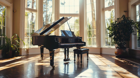 A grand piano in a sunlit room with large windows, emphasizing natural light and a serene, creative environment.