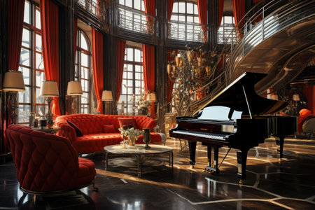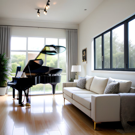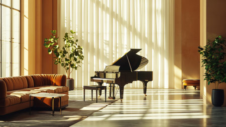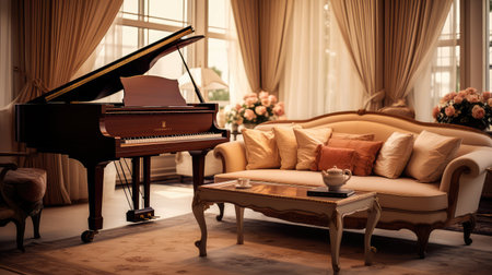 Grand piano sitting in the middle of elegant living room with sun light. AI generated