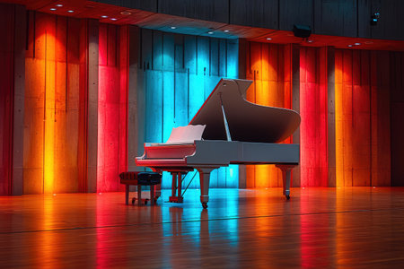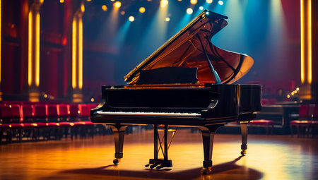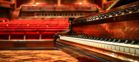 A majestic grand piano sits poised on stage, bathed in warm lights within a vintage theater. Rich red accents and elegant design enhance the artistic ambiance, inviting an unforgettable musical experience.