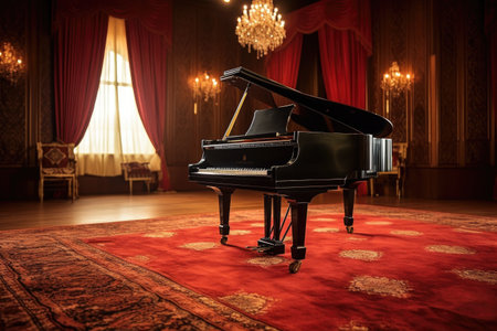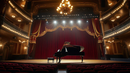 A grand piano takes center stage in an opulent theater, enhanced by dramatic lighting and rich red curtains. Perfect for showcasing musical artistry.