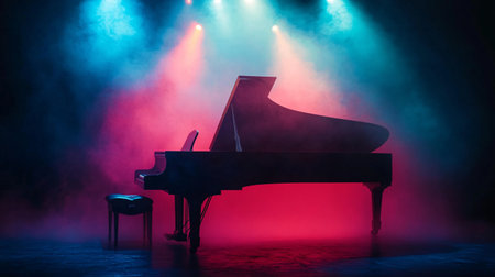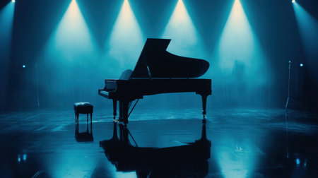 A striking silhouette of a grand piano set beneath captivating blue stage lights, surrounded by soft smoke, evokes a sense of elegance and creativity, perfect for musical performance themes.