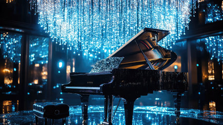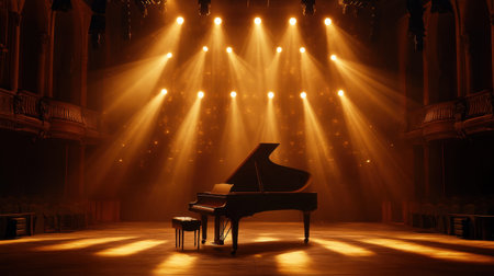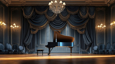A stunning grand piano sits poised on the stage of an elegant theater, surrounded by intricate decor and atmospheric lighting, evoking a sense of artistry and beauty.