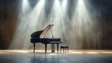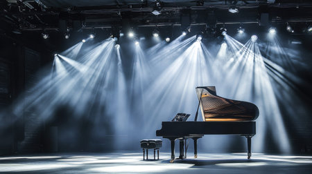 A beautifully lit grand piano set in an empty performance space, highlighted by dramatic spotlights creating an elegant atmosphere perfect for music.