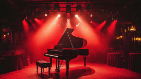 A grand piano takes center stage in a jazz bar, surrounded by dramatic red lighting and soft smoke, capturing the essence of live music performances.