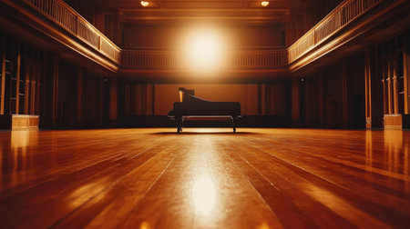 A grand piano sits alone on a beautifully lit stage, surrounded by an ornate theater interior that radiates warmth and elegance, evoking a serene atmosphere.
