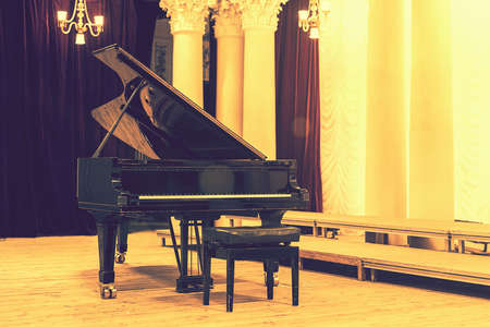 Grand Piano in Concert Hall. Piano standing on empty stage. opened black grand piano with stool on a wooden concert stage. toned