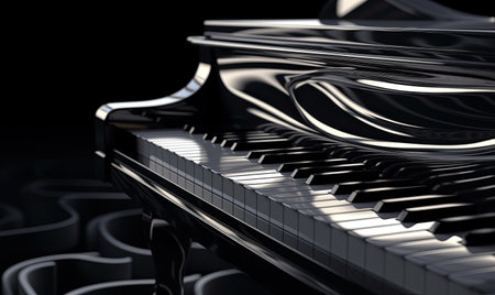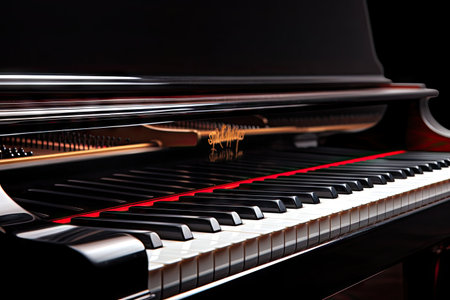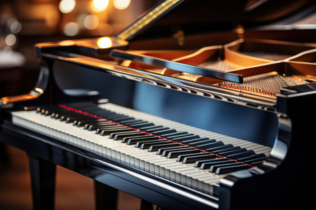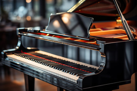 Close-up of a grand piano's polished black keys and body. The warm lighting creates a luxurious and elegant feel, perfect for musical performances or a sophisticated interior.