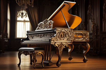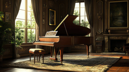 Elegant vintage grand piano with intricate carvings, set in an opulent room with large windows and a chandelier, exuding classical charm