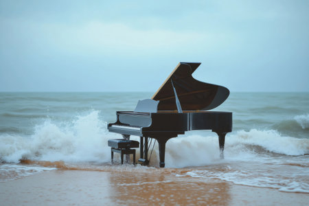 Black grand piano standing on a sandy beach with sea waves crashing around it, creating a dramatic and surreal scene