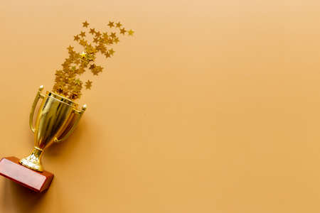 Golden trophy on wooden table with copy space