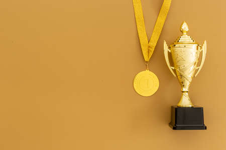 Gold medal first place and award trophy cup. Winner concept