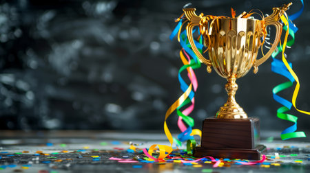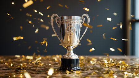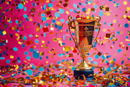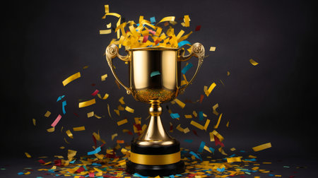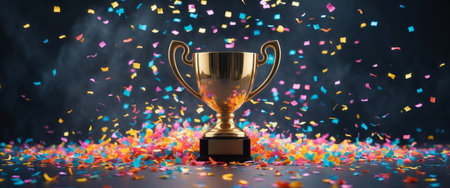 A golden trophy stands prominently against a dark backdrop, with confetti adding a celebratory touch, symbolizing achievement and success.