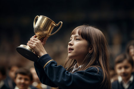 A vibrant image capturing the moment of celebration as a trophy is lifted high amidst a cheering crowd, symbolizing victory and achievement in an outdoor setting.