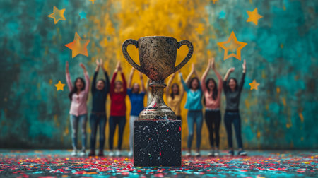 A gleaming golden trophy filled with confetti stands prominently in a celebratory office setting, symbolizing success, achievement, and recognition among enthusiastic individuals.