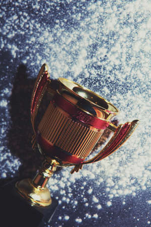 Golden trophy cup on table dark background with copy space. Creative artwork decoration with toned foggy backlight. Selective focus