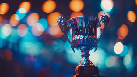 A trophy gleams brightly, showing its polished surface. The backdrop features a beautiful arrangement of colorful lights, creating a festive atmosphere during an award ceremony.