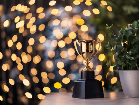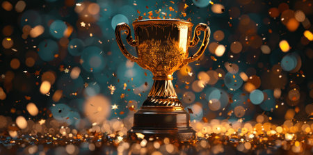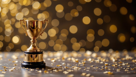 A golden trophy cup with confetti on table and glowing bokeh lights background, symbolizing achievement and celebration