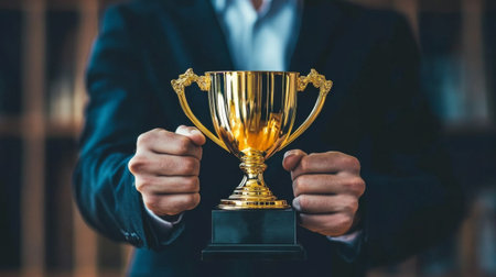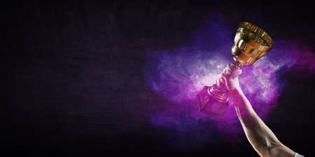 Hand holding up a gold trophy cup as a winner in a competition