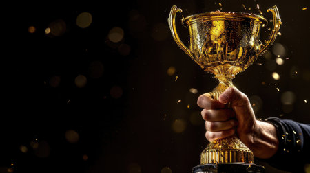 Hand holding up a gold trophy cup against dark background