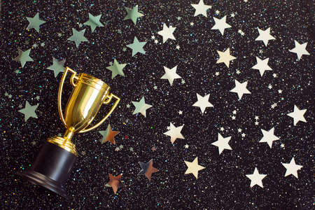 One Golden winner cup with silver stars sparkles on a black background.
