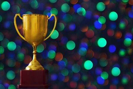 Golden trophy on pedestal with blurred bokeh lights background.